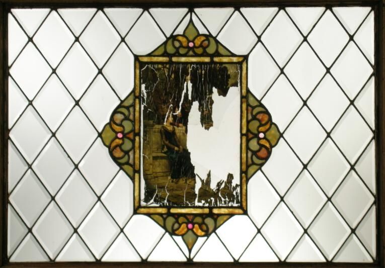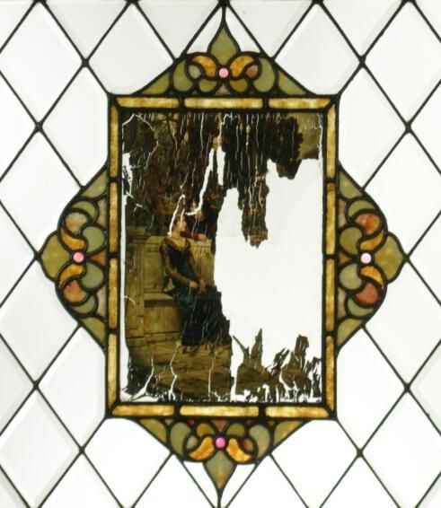 Paper picture of lady on bench plated between two sheets of glass, one broken so picture is disintigrating (so thin). Geometric beveled diamond pattern in background; flowered pattern surrounding center.