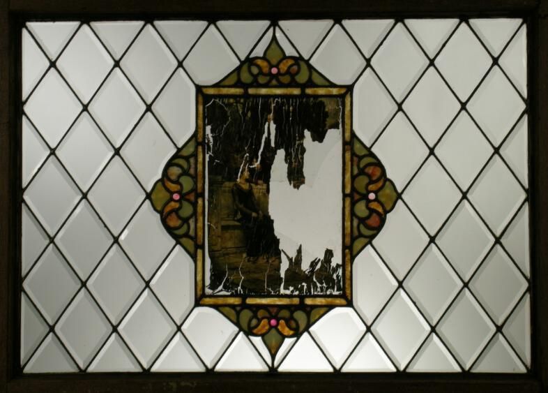 Material: Beveled glass diamond pattern border; paper picture sandwiched between clear glass. Cedar sash.Lexicon