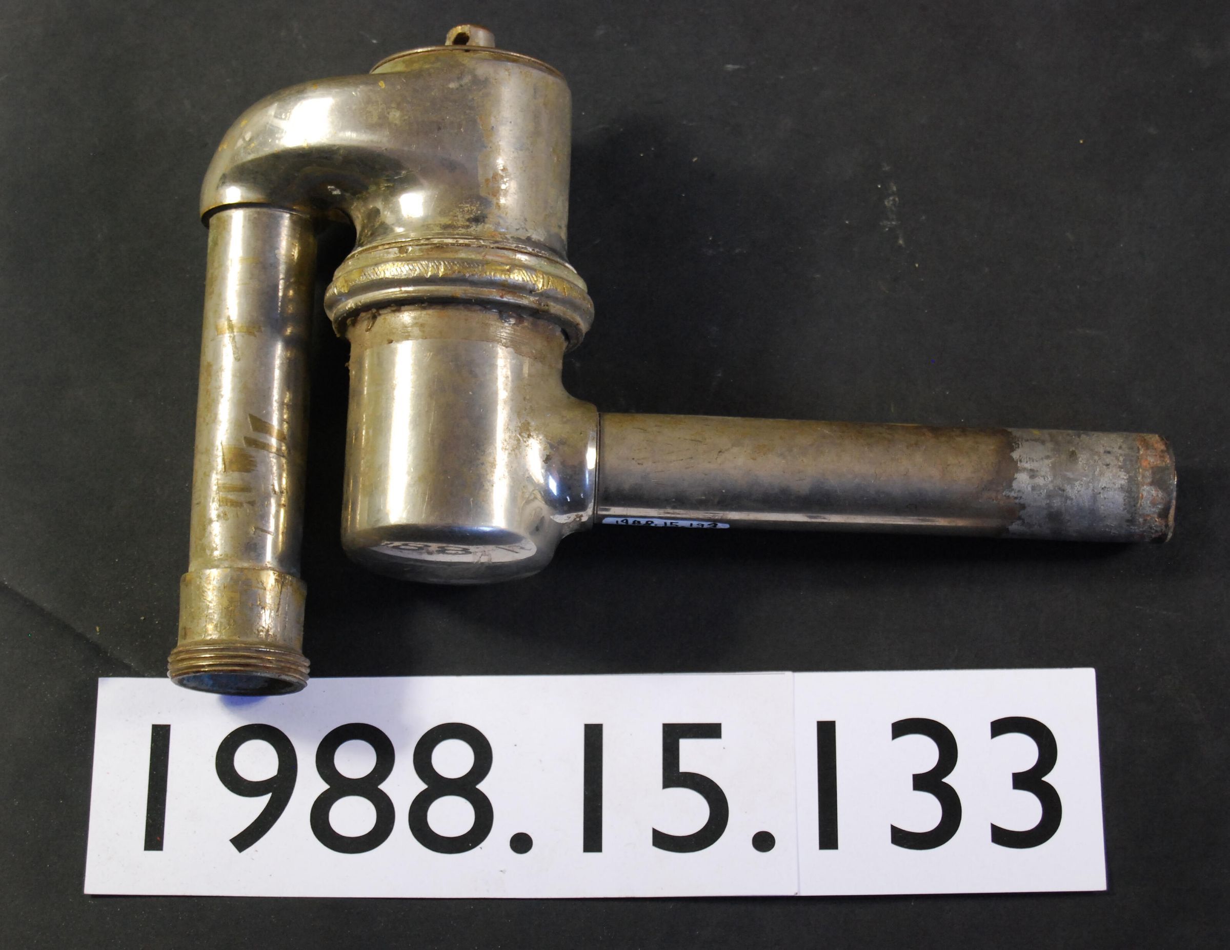 Nickel-plated brass drain trap composed of two hollow components joined together by compression fitting. Each end has projecting pipe. Top of trap has cap with inscription: THE IDEAL MFG. CO. DETROIT MICH.