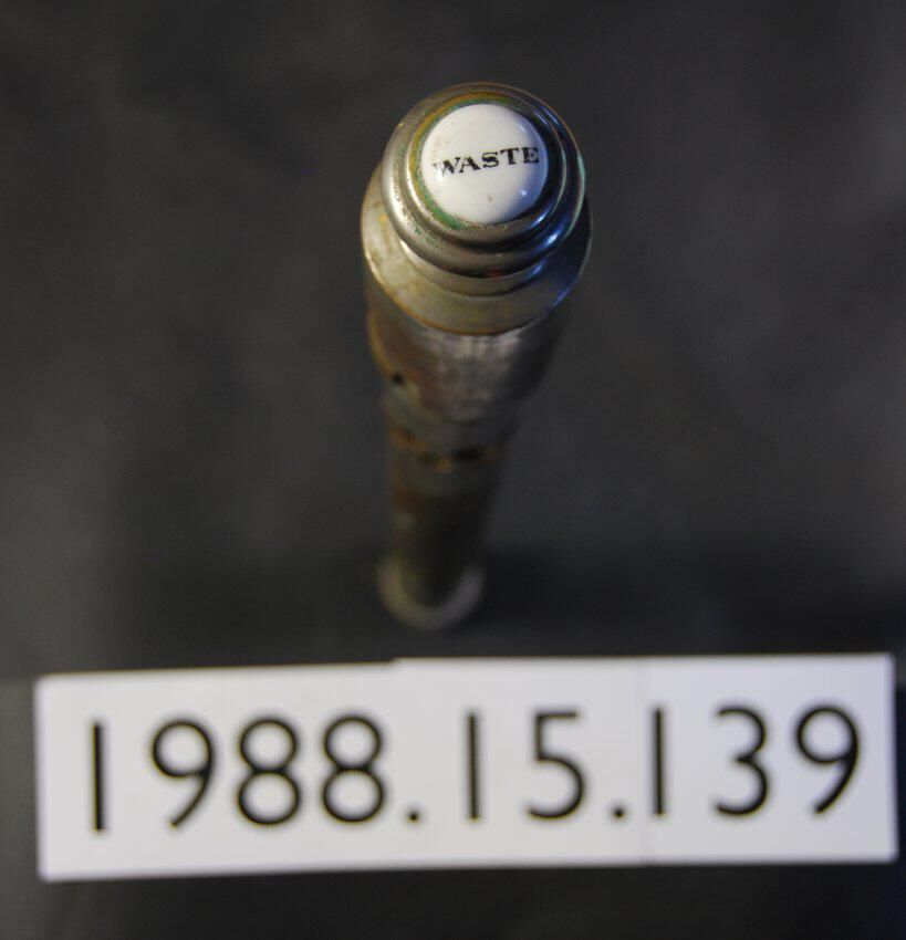 Nickel-plated brass drain control / handle for sink. Has vitreous ceramic button on top of handle marked "Waste." Inscriptions or Markings: Manufacturer: Place of Manufacture: Design motif: Style: Finish: Plated