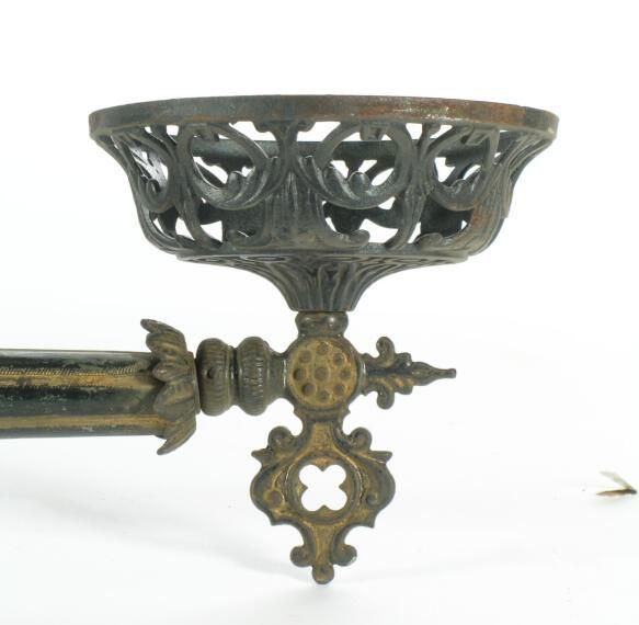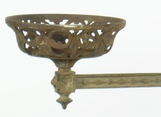 Eastlake/Aesthetic style cast iron ceiling chandelier. Font-holders don't match. Shades: none Fuel: kerosene Finish: other