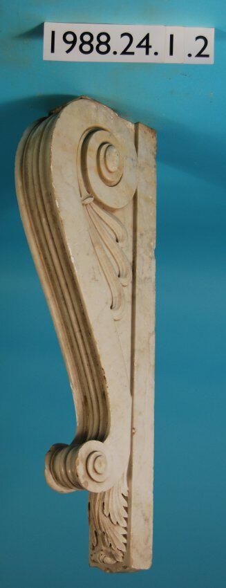 Interior classical revival style carved marble bracket. Reeded front. Scrolled sides. Botanical motifs. Originally mounted at ____________________ Multnomah County Courthouse.