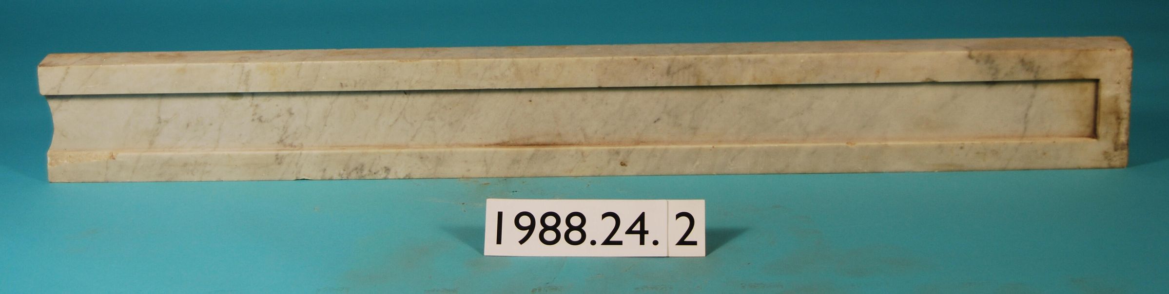 (Interior). Rectangular marble slab casing. Recessed panel on front. Has indent on top end to engage bracket. Polished white / grey veined marble.