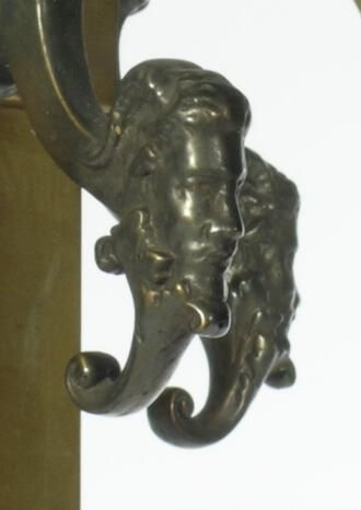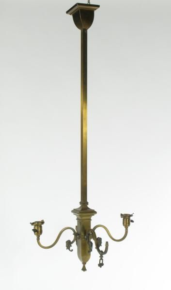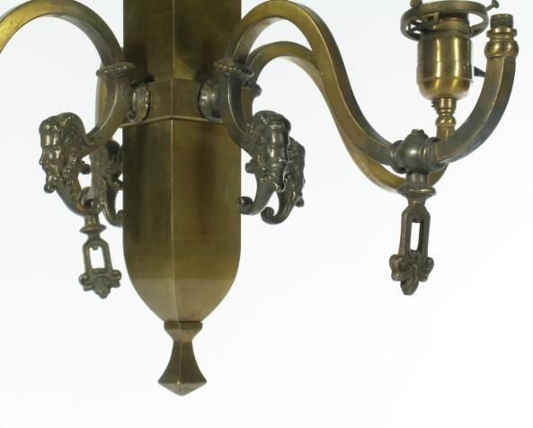 Mission style brass ceiling chandelier with 4 arms (2 gas, 2 electric). Square canopy, squared body, 4 Pan-figured ornaments.