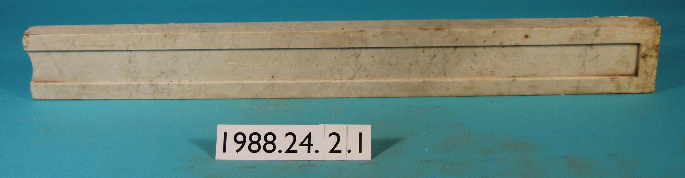 (Interior). Rectangular marble slab casing. Recessed panel on front. Has indent on top end to engage bracket. Polished white / grey veined marble.