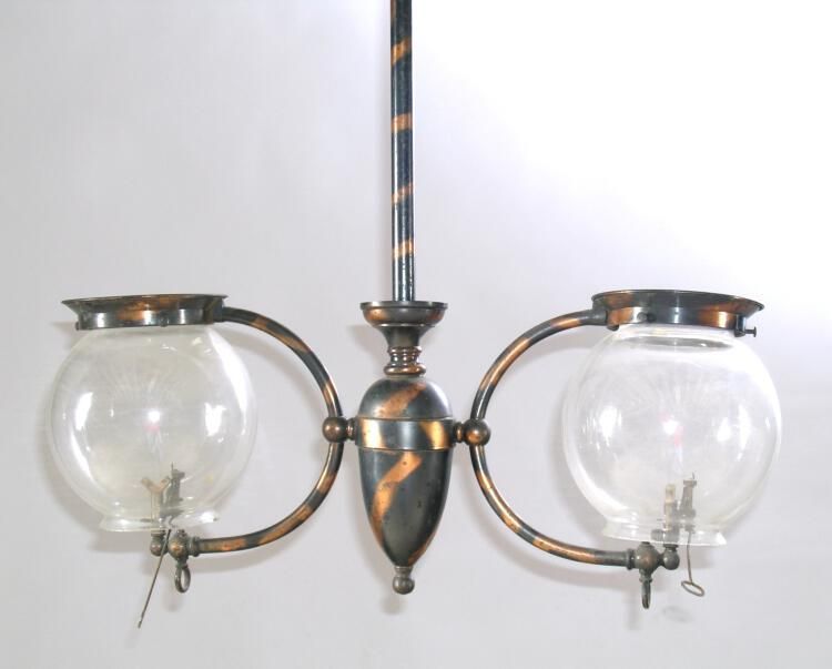 Victorian Vernacular style brass 2 shade ceiling chandelier. Shades are glass globes. Acetylene.