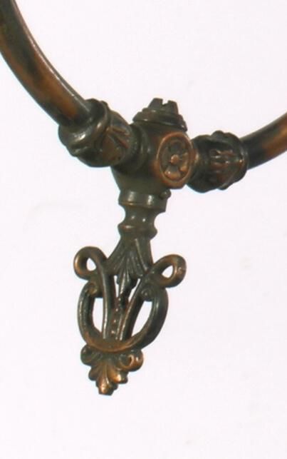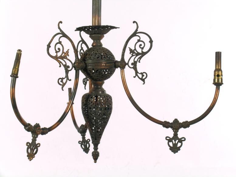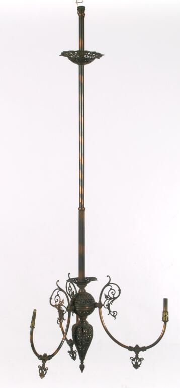 Empire style brass ceiling chandelier with 3 arms. Filigree canopy, pendant, and ball. High quality casting.