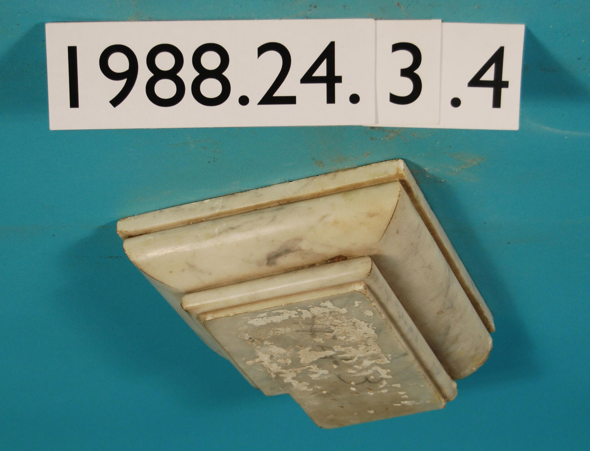 Interior molding block with compound molding profile on three edges. Polished white / grey veined marble. Associated with brackets from Multnomah County Courthouse.