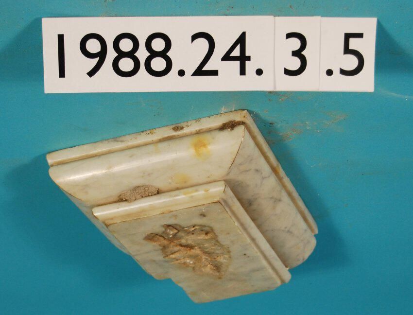 Interior molding block with compound molding profile on three edges. Polished white / grey veined marble. Associated with brackets from Multnomah County Courthouse.