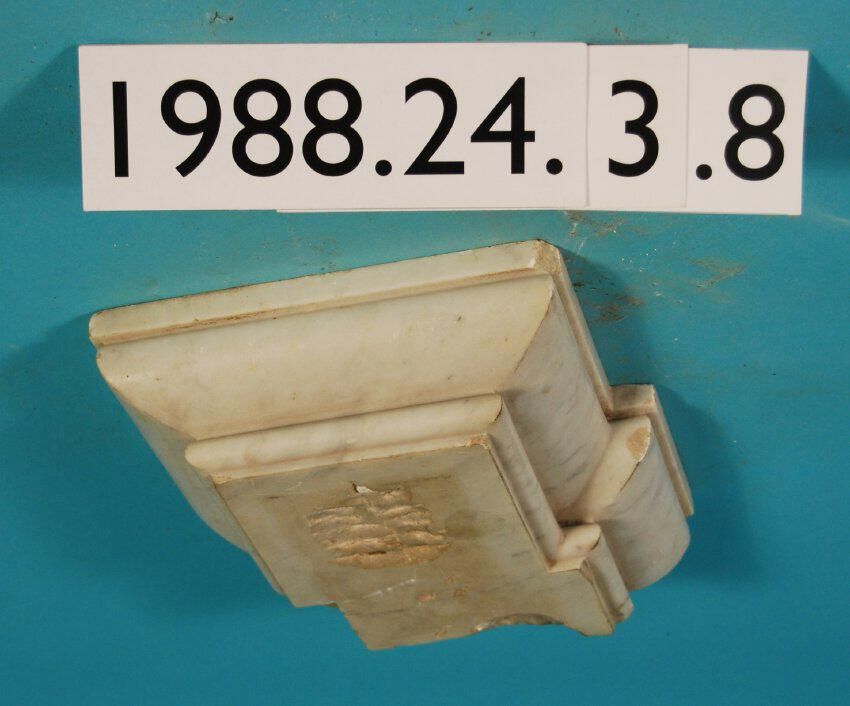Interior molding block with compound molding profile on three edges. Polished white / grey veined marble. Associated with brackets from Multnomah County Courthouse.