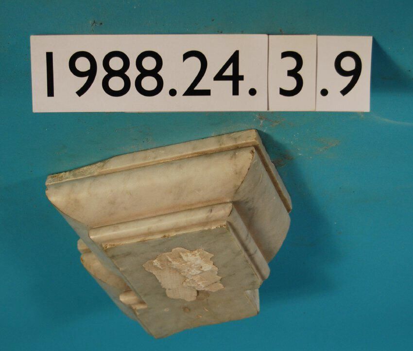 Interior molding block with compound molding profile on three edges. Polished white / grey veined marble. Associated with brackets from Multnomah County Courthouse.