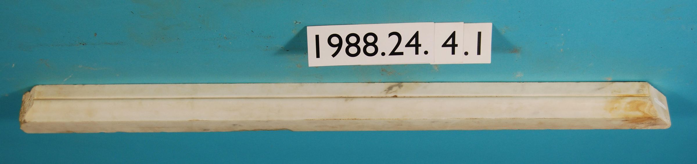 Interior molding compound molding profile. Mitred on both ends. Polished white / grey veined marble. Possibly from Multnomah County Courthouse(?)