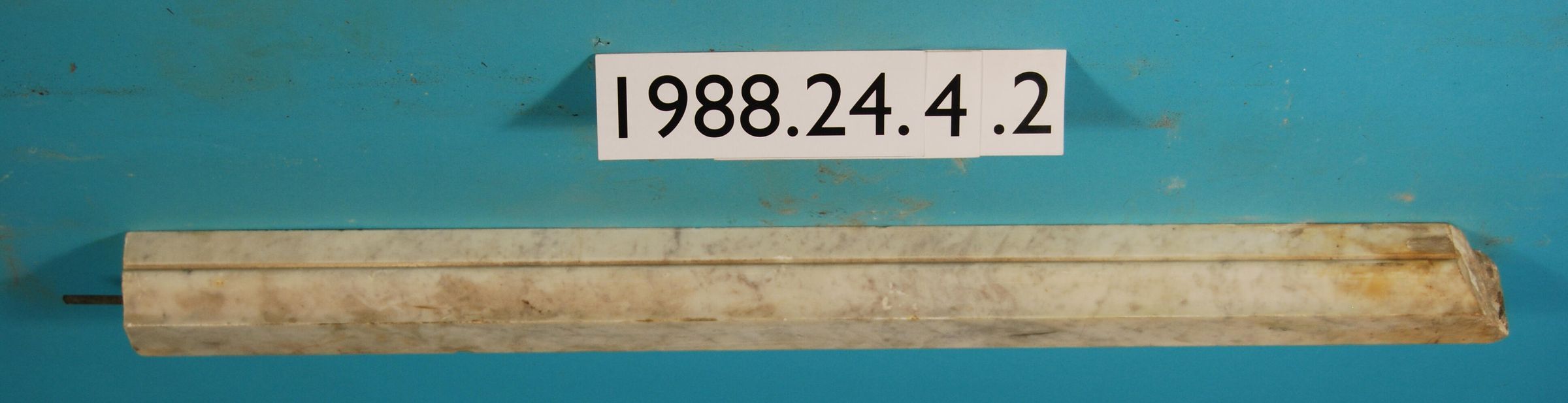 Interior molding compound molding profile. Mitred on one end. Brass rod at other end. Polished white / grey veined marble. Possibly from Multnomah County Courthouse(?)