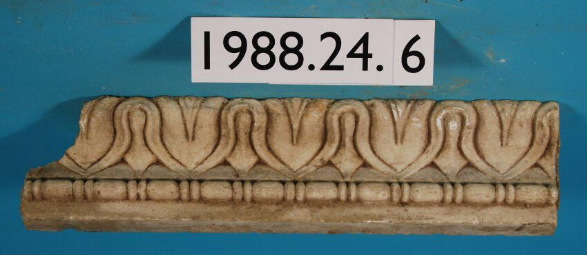 Curved white marble. Compound molding profile. Lamb's tongue and dart and bead and reel motifs. Unpolished surface.