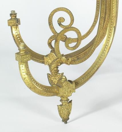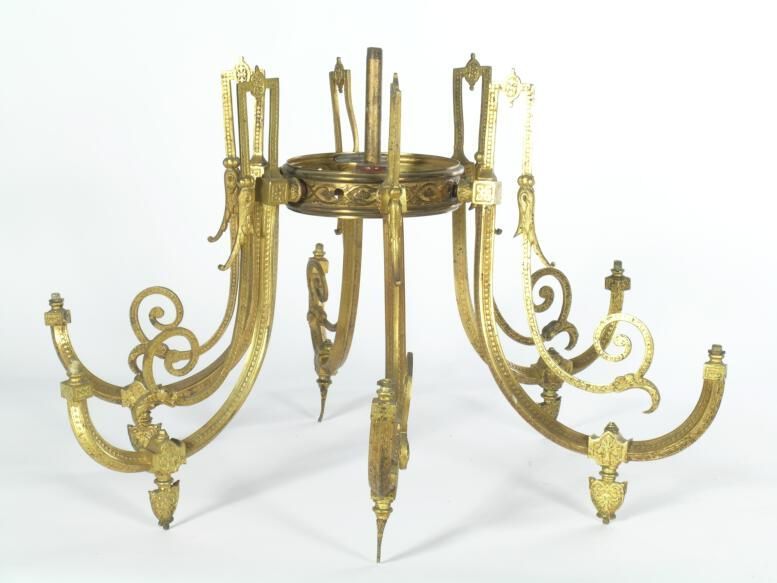 Brass ceiling chandelier with 6 arms. A combination of styles: flat design (Eastlake inspired); trim (Gothic); heaviness (Renaissance Revival). Each arm turns on separately (3 arm arrangement).