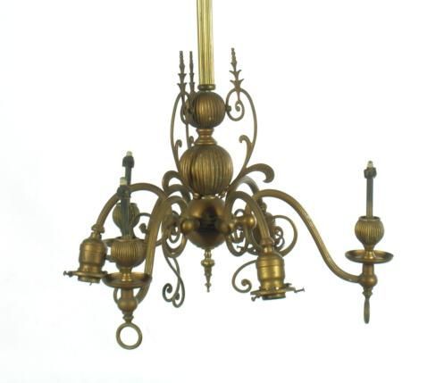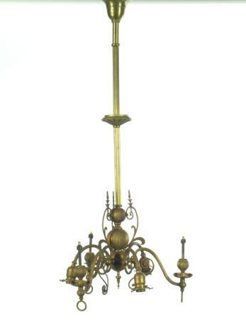 Victorian Vernacular style brass ceiling chandelier. Shades: 2 1/4" Fuel: Combination Gas candles and electric Finish: Gilt
