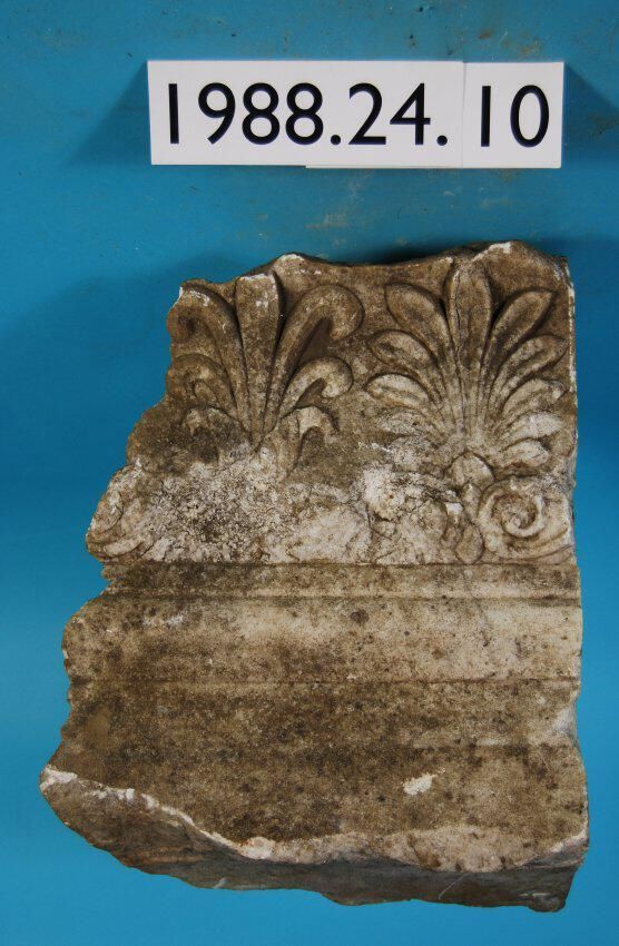 Irregular curved white marble block with acanthus leaf motif ornamentation. Broken from larger block of unknown function (could be building component or part of grave monument). Unpolished surface.