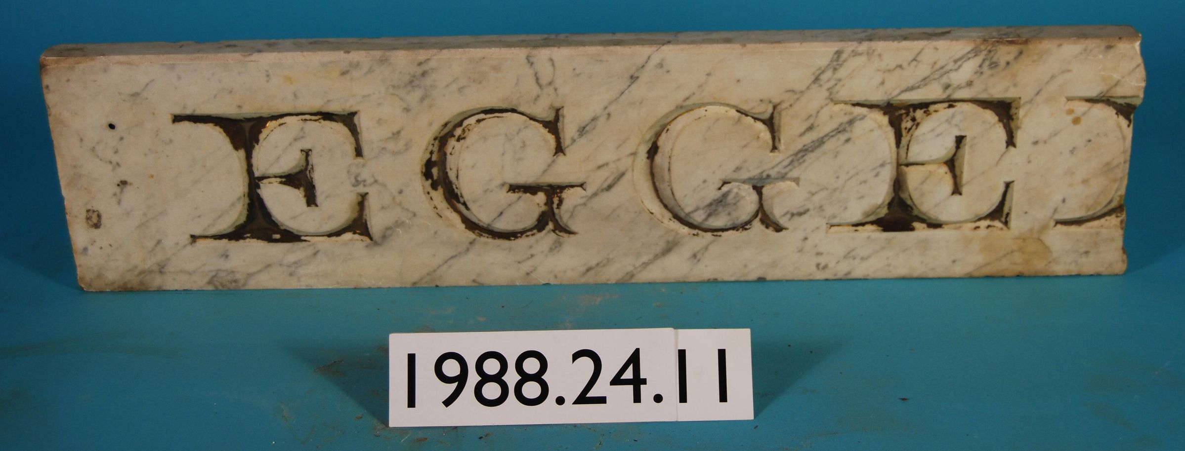 Rectangular polished white / grey veined marble slab with carved inscription: "EGGE. . . One end is truncated. Letters originally gilt.