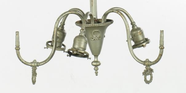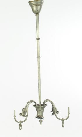 Victorian Vernacular style brass ceiling chandelier. 2 gas arms, 3 electric arms. 2 reeded sections with a smooth section. Empire features. Colonial Revival beading.