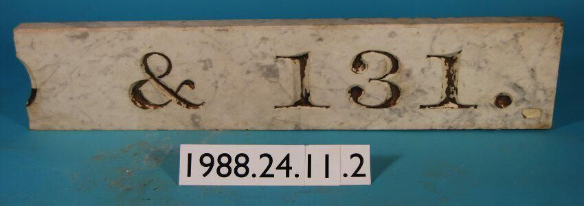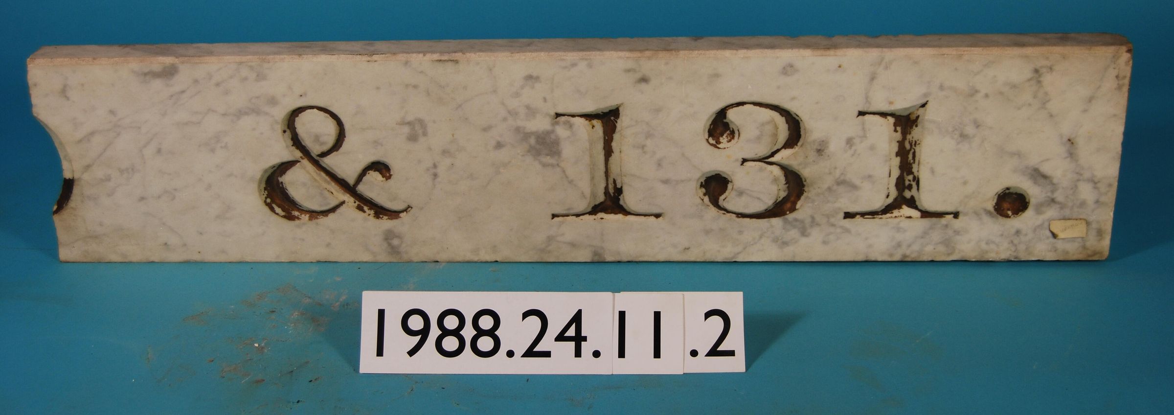 Rectangular polished white / grey veined marble slab with carved inscription: . . . "& 131." One end is square cut. Other end is truncated. Letters originally gilt.