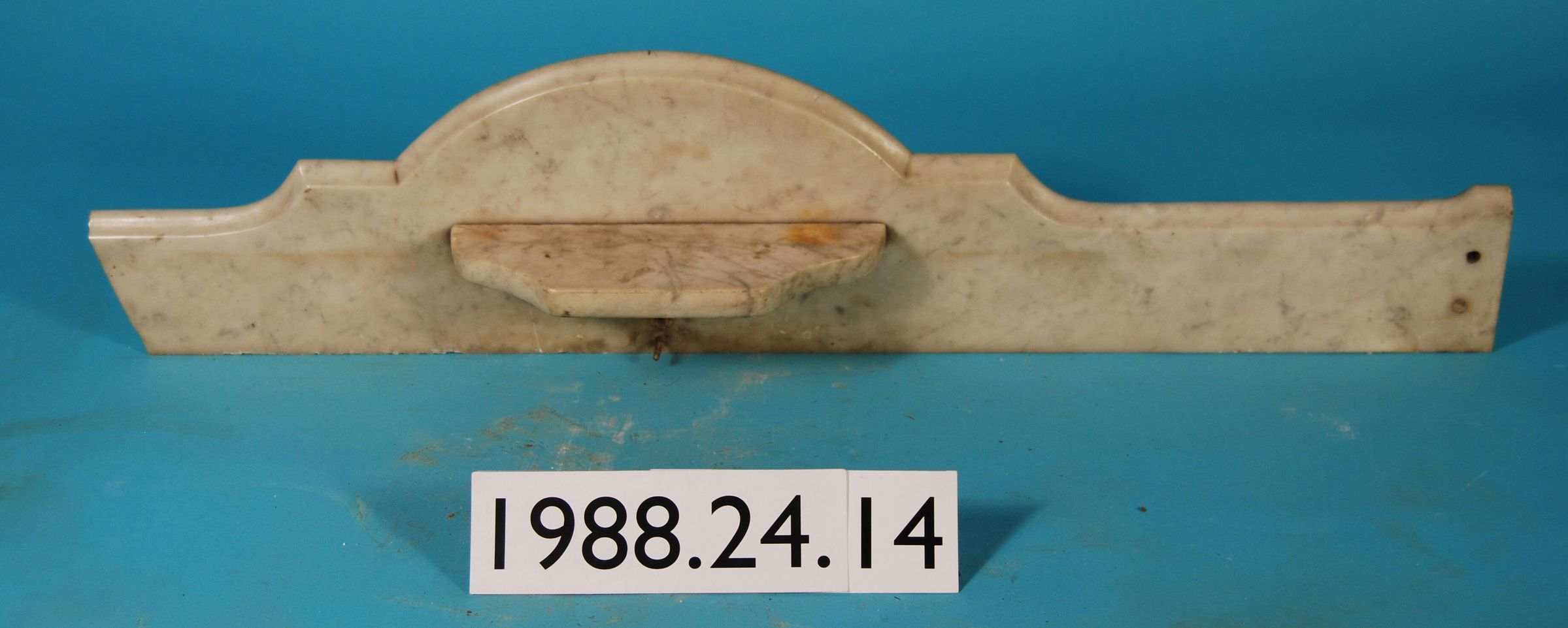 Polished white / grey veined marble backsplash. Has curved pediment at top edge. Small shelf mounted at front. One end is truncated. Could be from wash stand or furniture.
