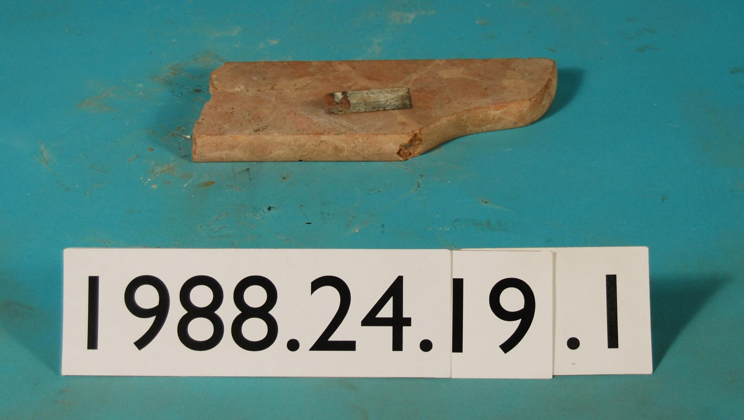Mottled orange polished marble bracket. Truncated at top end. Curved front edge. Unknown function. Probably from imported antique furniture. Sticker says: "DUNCAN'S IN PORTLAND."