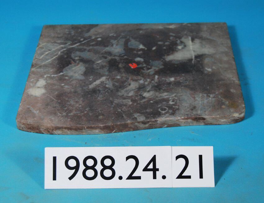 Mottled reddish / brown polished marble slab. Curved on front edge. Probably part of imported antique furniture.