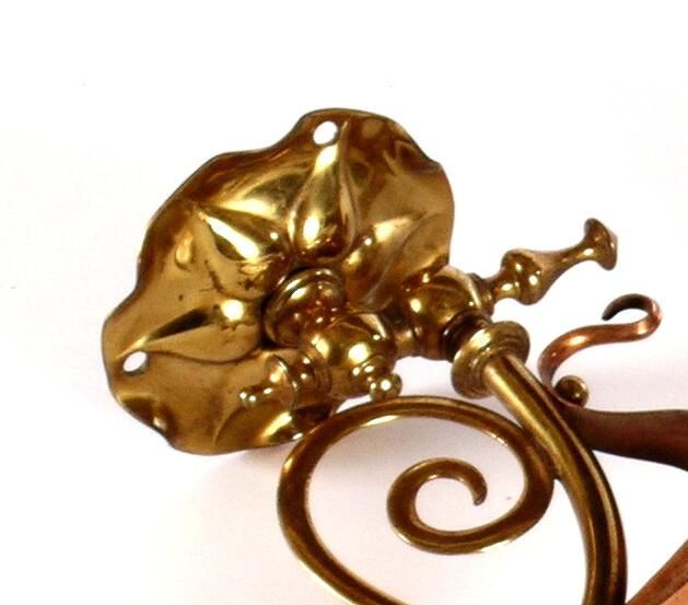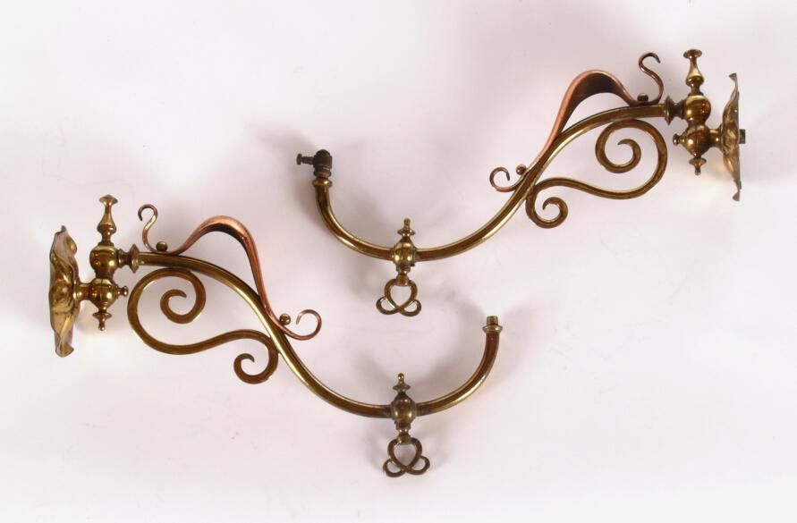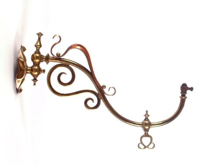 One of a pair with 1988.9.75. Arts & Crafts brass wall bracket with adjustable arm. Could be English in origin. Shades: unknown Fuel: Gas Finish: Polished
