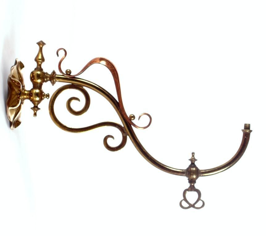 One of a pair with 1988.9.74. Arts & Crafts brass wall bracket with adjustable arm. Could be English in origin. Shades: unknown Fuel: Gas Finish: Polished