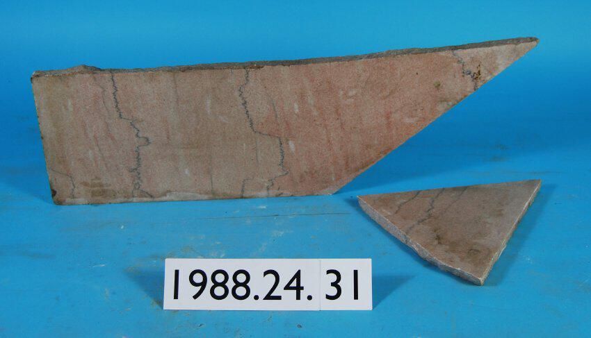 One lot of two pinkish / grey veined polished marble slabs. One is triangular. The other is rectangular, with angular end.