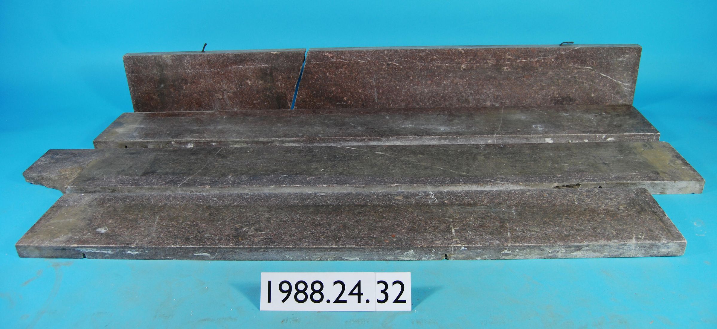 One lot of four rectangular pinkish mottled polished marble slabs. One is broken into two pieces. One other has truncated corner. Possible baseboards (?)