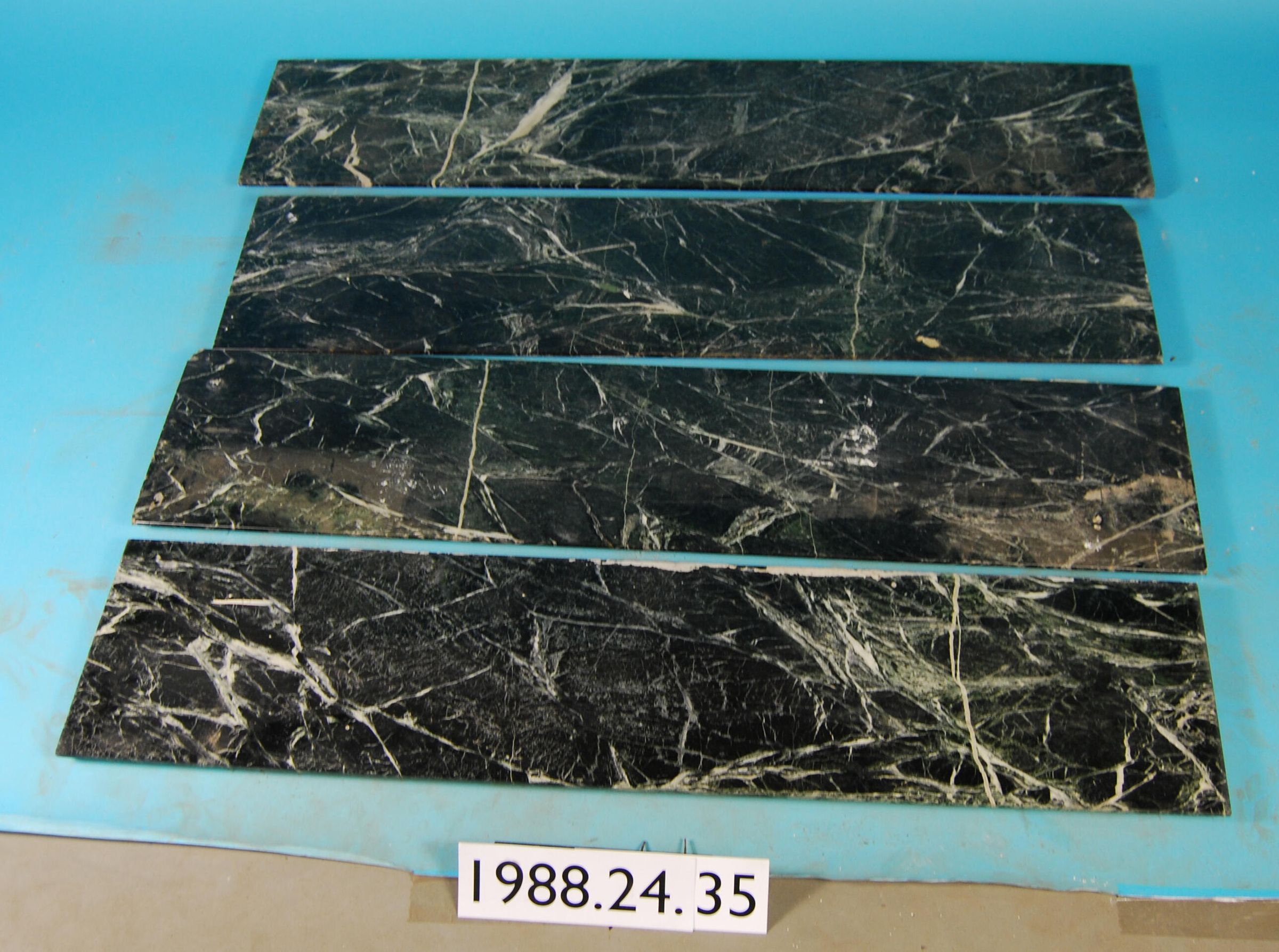 One lot of four rectangular black / greenish / white veined polished marble slabs. Each slab has one beveled edge. Has drilled holes and copper wire mounts. Sizes and installation notes on backs.