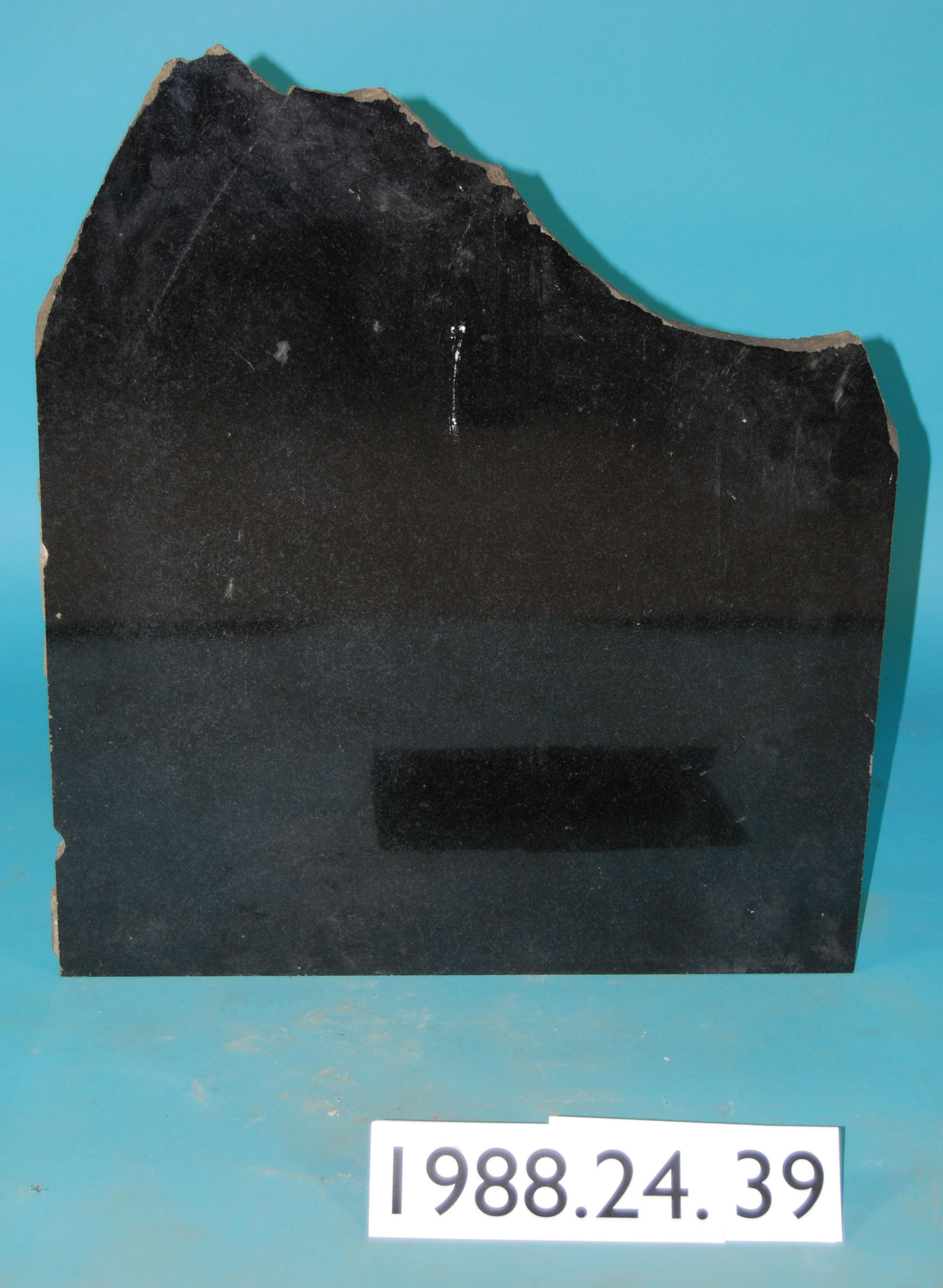 Semi-rectangular black polished marble slab. (Three square-cut edges. One end truncated).
