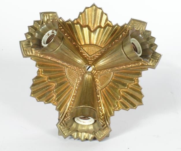 Art Deco style brass ceiling flush. Marquee sockets. Large stamped pan.