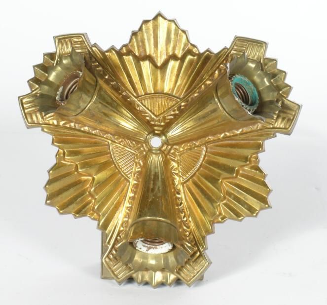 Art Deco style brass ceiling flush. Marquee sockets. Large stamped pan.