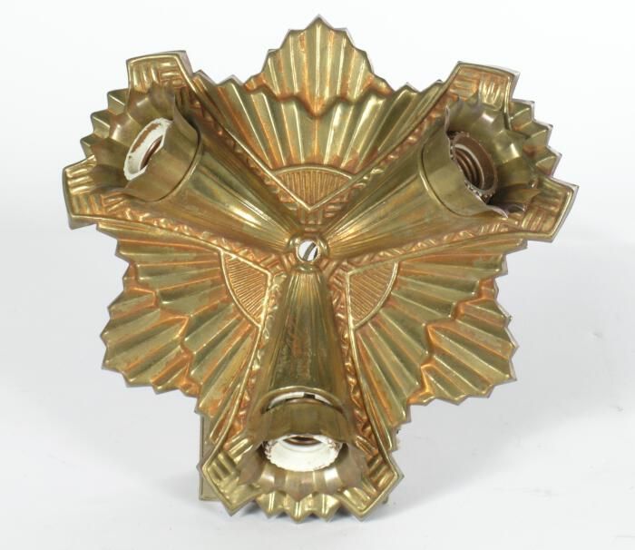 Art Deco style brass ceiling flush. Marquee sockets. Large stamped pan.