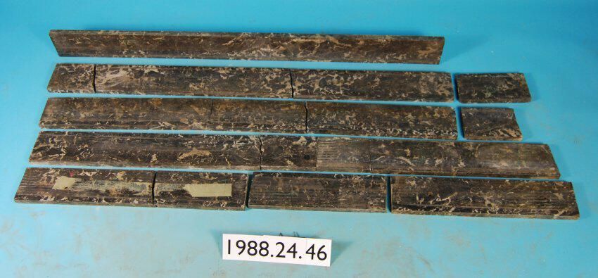 One lot of ten sections (with total of 16 pieces including broken fragments). Rectangular gray / white mottled polished marble baseboards with drilled holes for mounting.