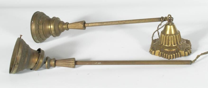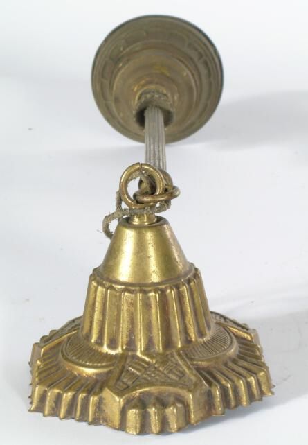 One of a set with 1988.9.90 & .91. Art Deco style brass ceiling pendant. Shades: 4" electric Fuel: Electric Finish: Unknown