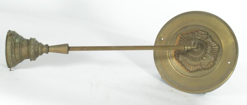 One of a set with 1988.9.90 & .91. Art Deco style brass ceiling pendant. Shades: 4" electric Fuel: Electric Finish: Unknown