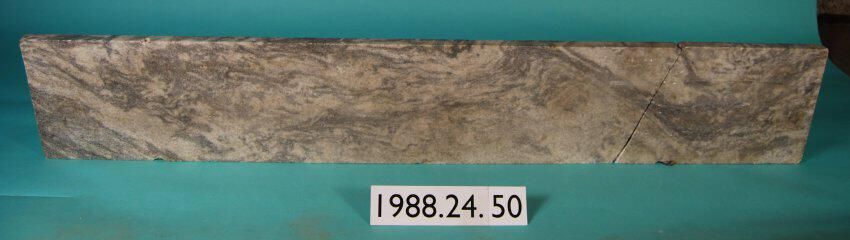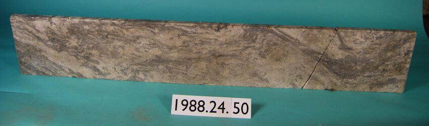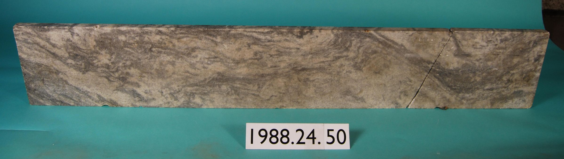 Rectangular white / gray veined polished marble slab with series of holes for hardware mounts. (Broken) into two pieces.