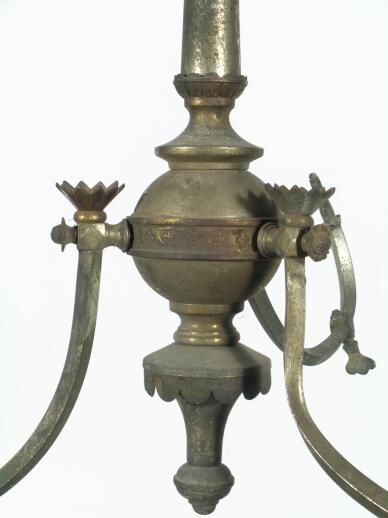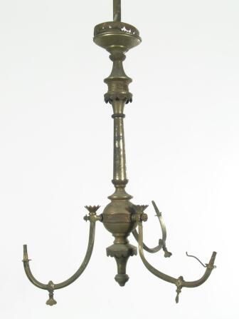 Eastlake/Aesthetic style brass ceiling chandelier. Shades: 4" gas Fuel: Gas Finish: Originally nickel plated