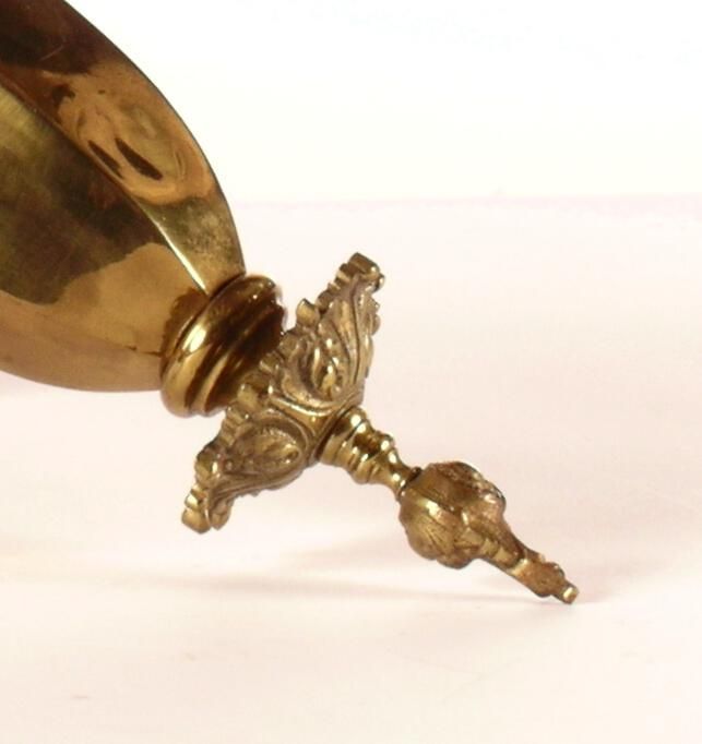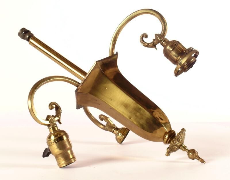 3 arms; flowered band on shade fitter; cast arm backs & finial; hexagonal body, hexagonal tubing arms.