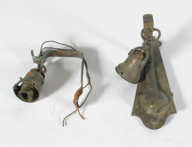 Arts & Crafts style brass wall bracket. 1 light; stamped. Original finish. Shades: 2 1/4" electric Fuel: Electric Finish: Aged