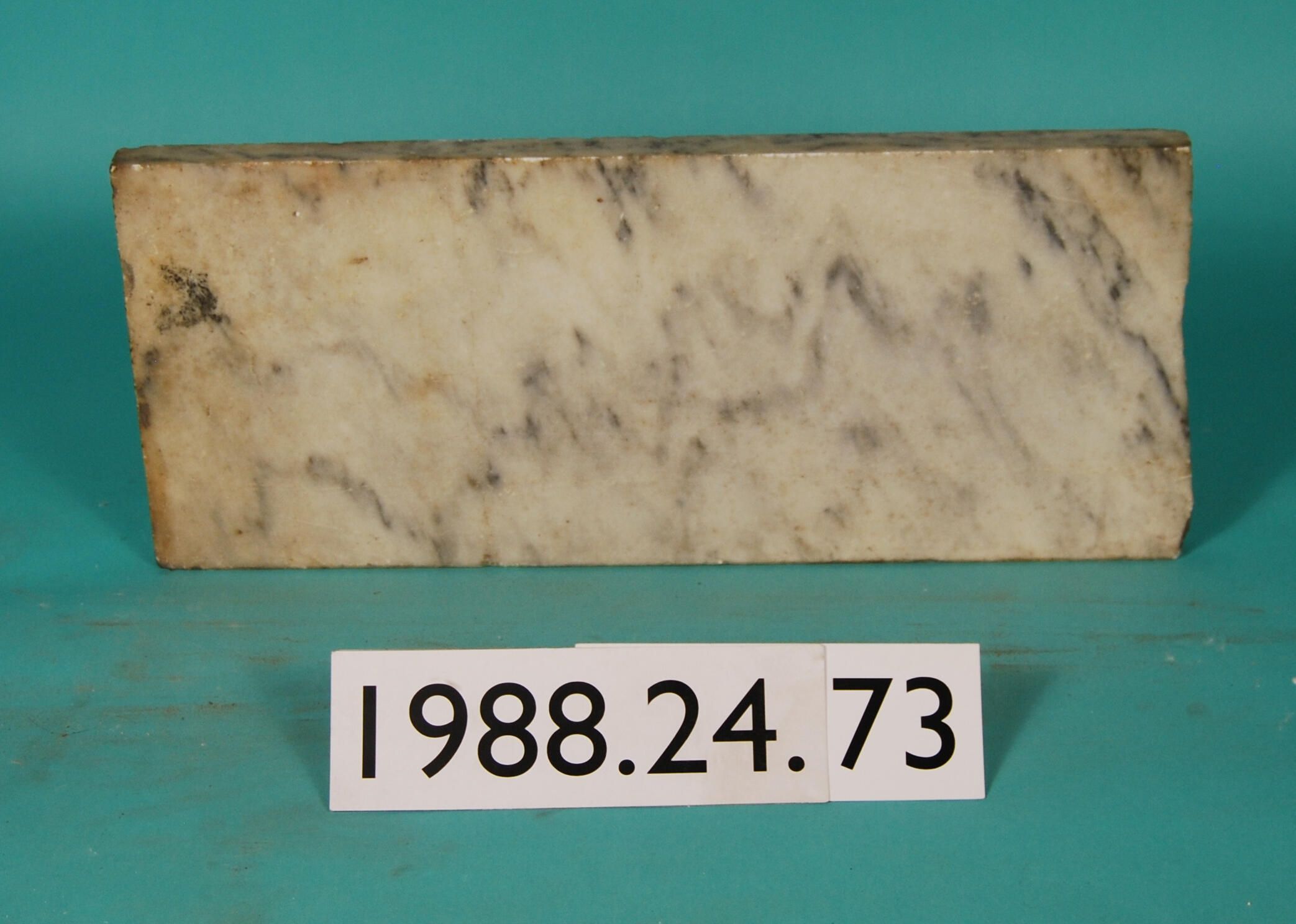 Rectangular white / gray veined polished marble slab. Truncated at one end.