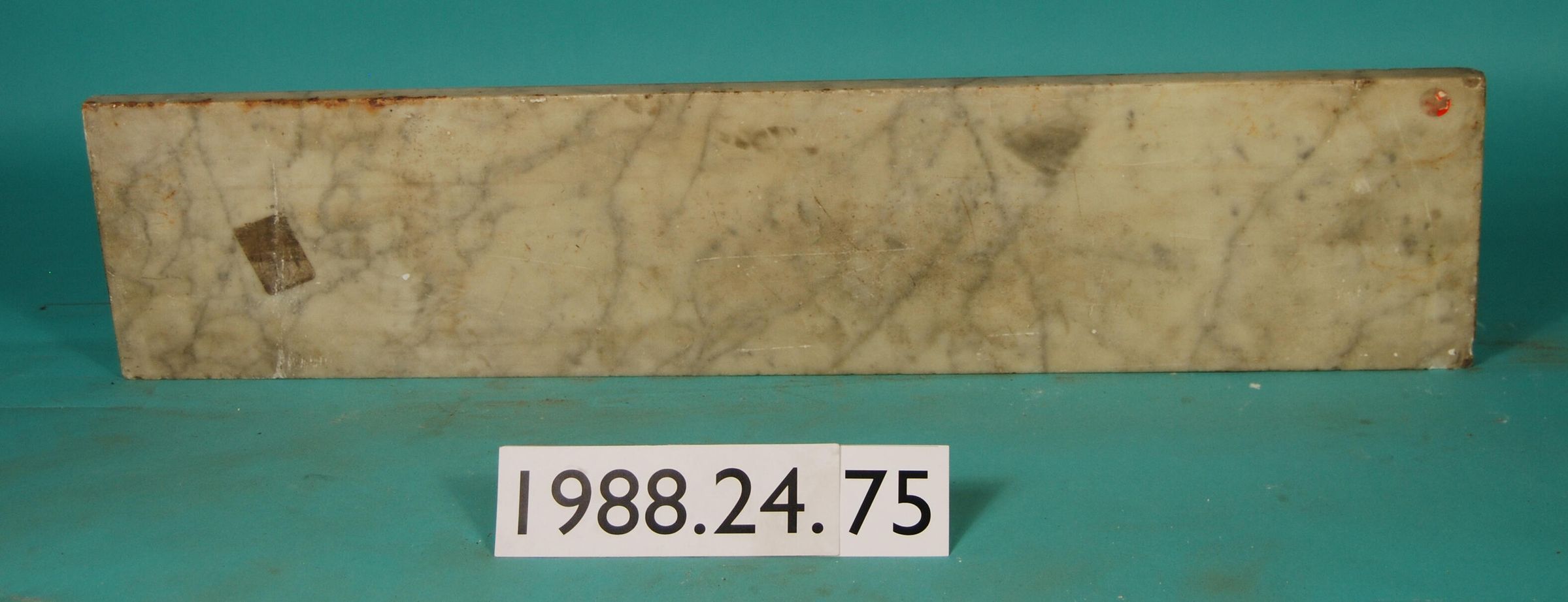 Rectangular white / gray veined polished marble slab. Has two holes drilled through face.