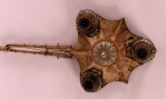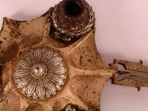 Late Deco style cast iron ceiling pendant. 3 exposed bulbs. Shades: None Fuel: Electric Finish: Polychrome