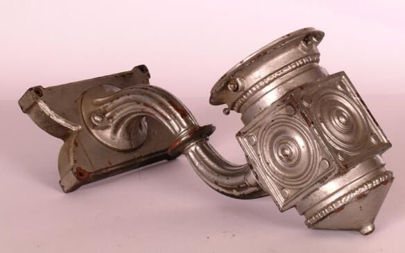 One of 3 matching fixtures with 1988.9.123, .124. Neoclassical , federal style cast iron wall bracket. Shades: Unknown Fuel: Unknown Finish: Painted silver finish (not original).