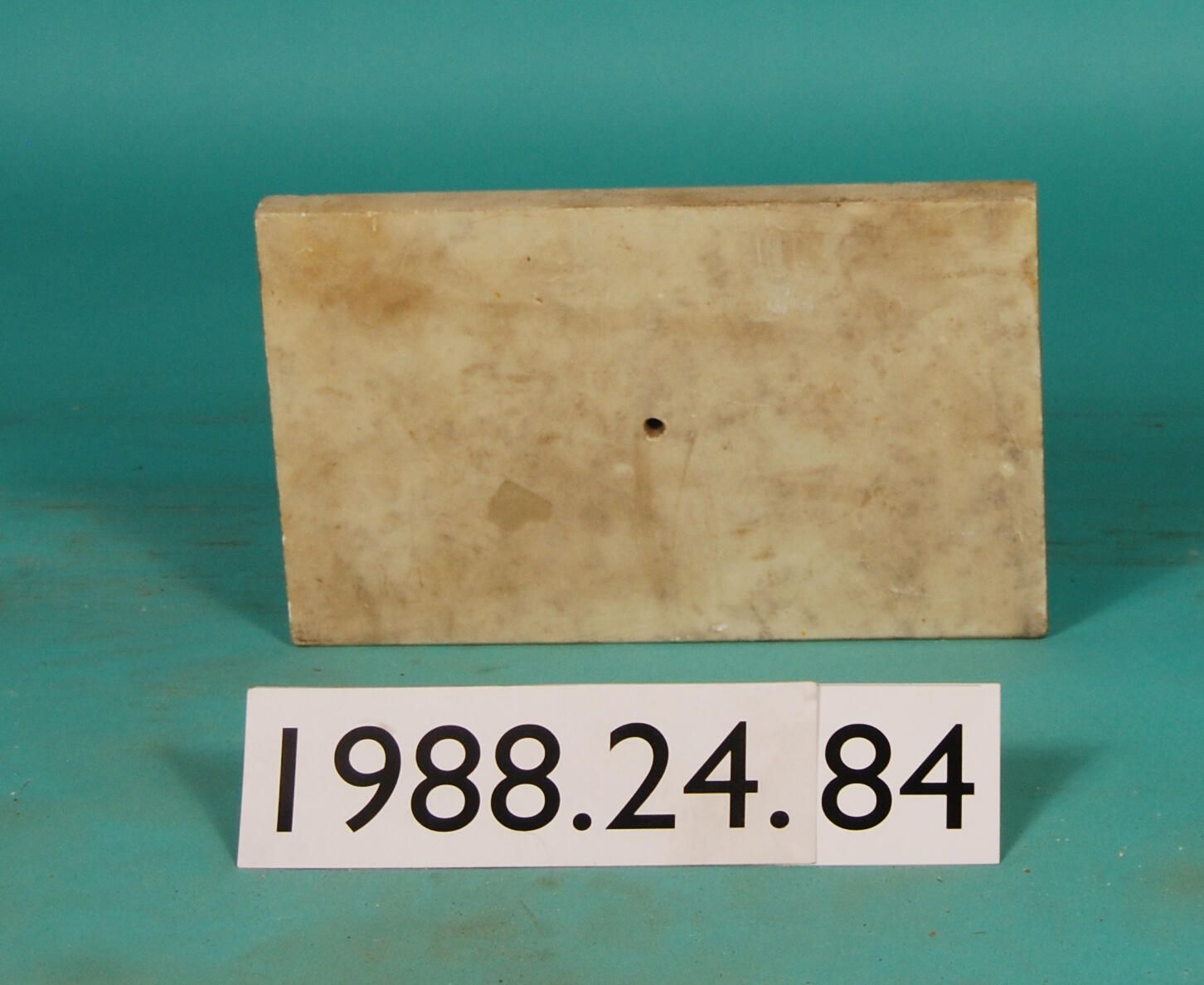 Rectangular white / gray veined polished marble slab with hole drilled through center of face. Possible baseboard.