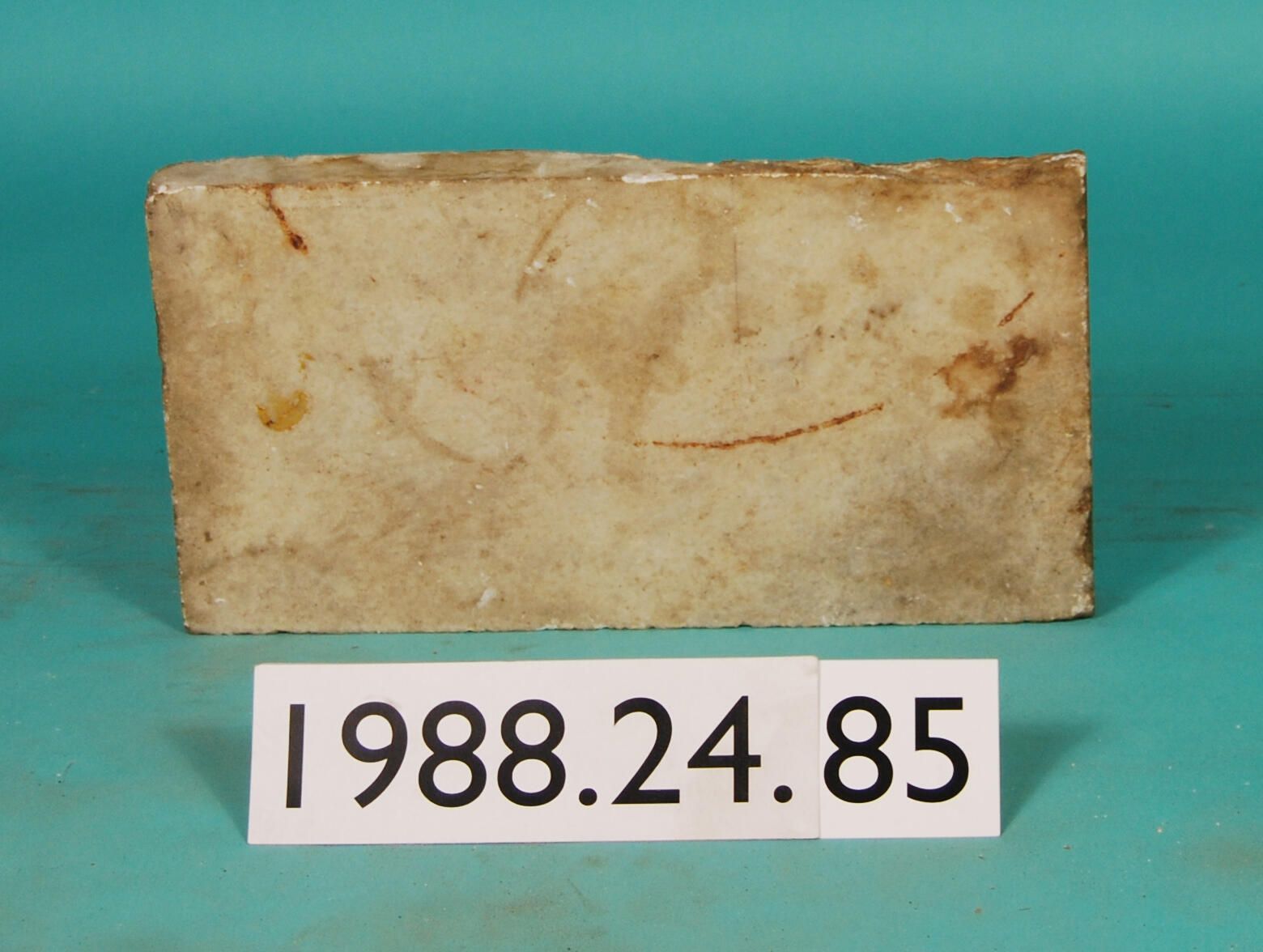 Rectangular white / gray veined polished marble slab. Chipped on edge.