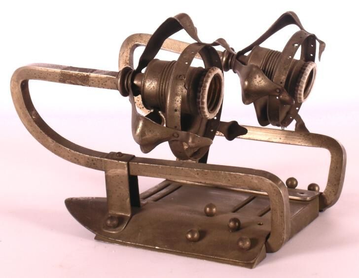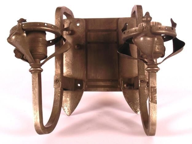 Arts & Crafts style wall bracket. Possibly nickel; 2 arms. Art Nouveau socket husks. Shades: None Fuel: Electric Finish: Brushed